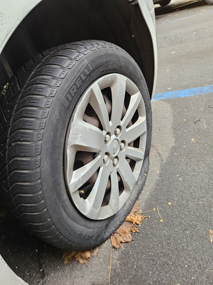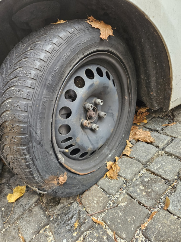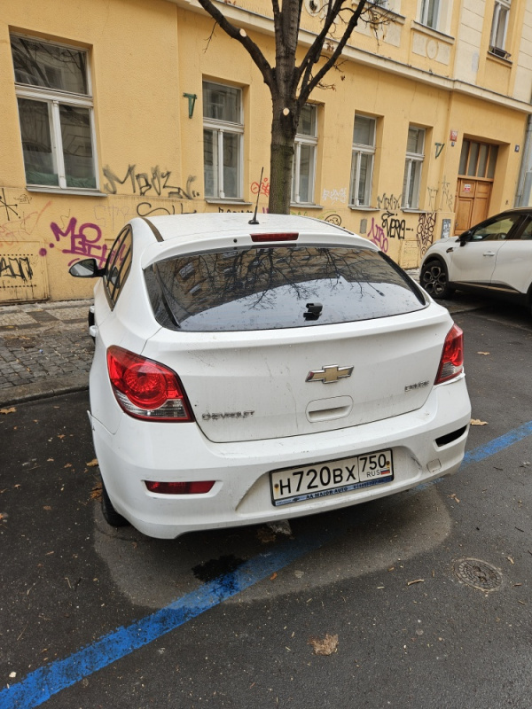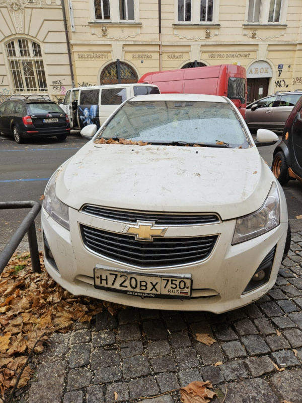 Chevrolet, bílá barva, ruská RZ: H720BX 750. Stojí zde od začátku října. Prázdná obě kola na levé straně.