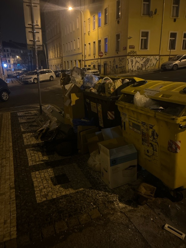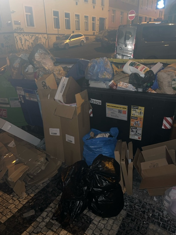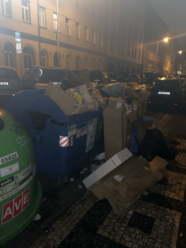 Dobrý den, děkujeme za Váš podnět. Tato plocha by měla být pravidelně uklízena pracovníky svozové služby. V rámci pravidelného úklidu by měli vše odstranit. Následně, hned jak to bude možné, provedeme kontrolu, zda se tak skutečně stalo a případně místo poklidíme. Krásný den Vaše Čistá Trojka