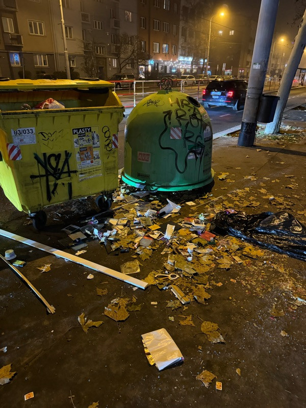 Vysypaný obsah žlutého kontejneru a rozházený po ulici