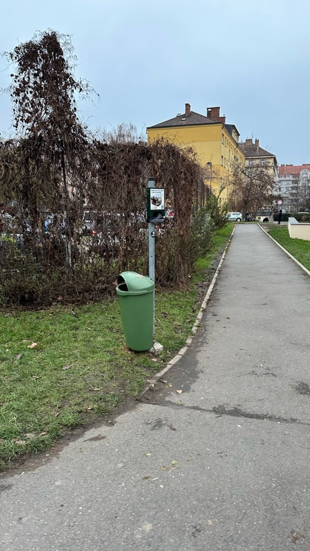 Ve stejném stavu byl koš na konci ulice Nad ohradou před vjezdem do garážového domu, ten dorpočuji zkontrolovat také (nevím ale jestli už není opraven).