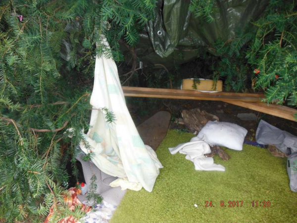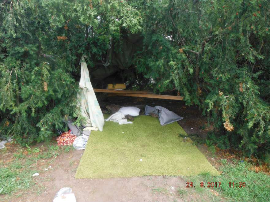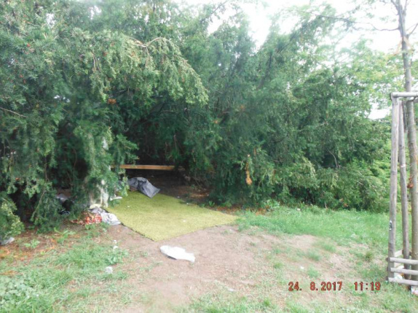V křoví v parku Židovské pece u lampy VO č. 301860 se nachází nepořádek ( koberec, hadry, dřevěné desky, polyuretanová matrace a celta(