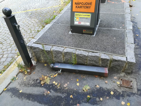 Urezlý ležící sloupek ohrazení kontejnerů.