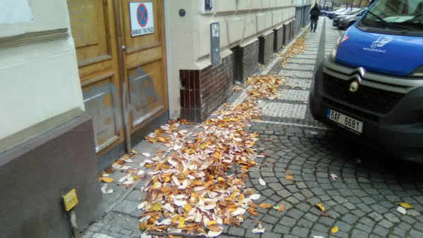 Rozházené odpadky na chodníku od nám. Jiřího z Poděbrad až po ul. Orlická.
