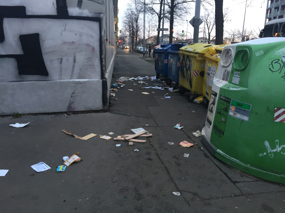 U kontejnerů na křižovarce ulic Korunní a Libická zase řádili bezdomovci. Díky za uklizení