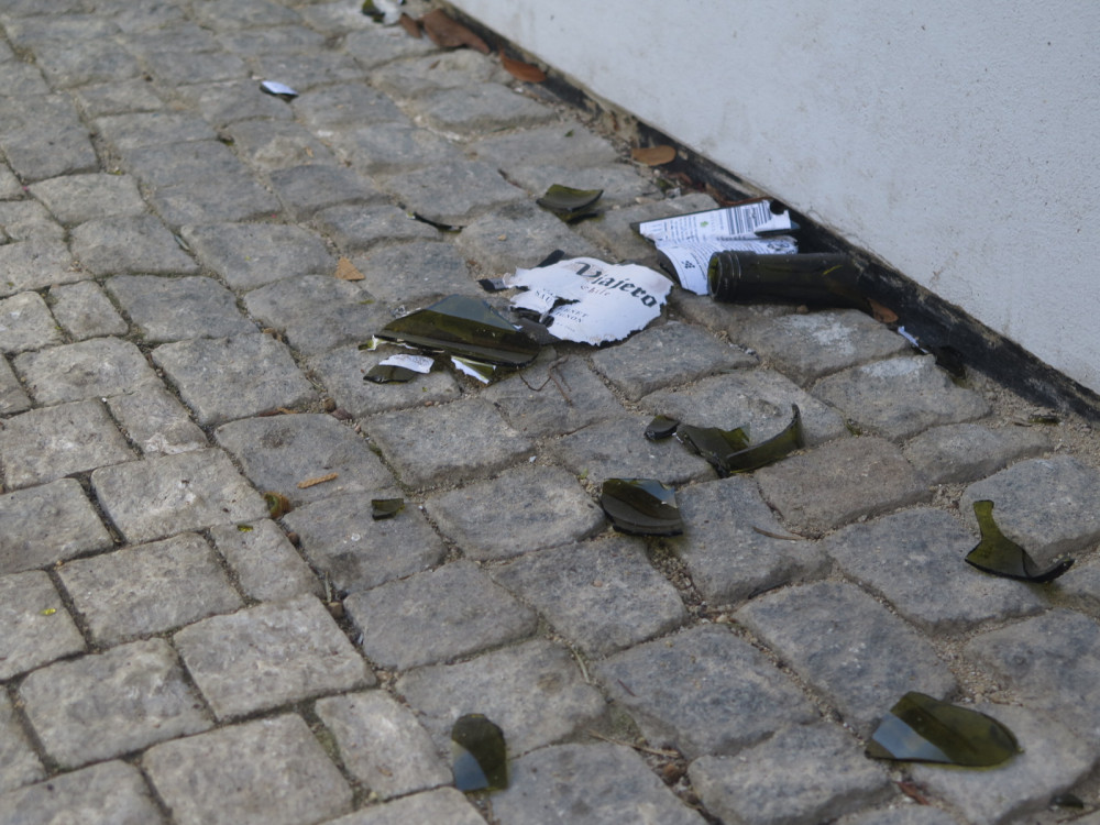 Rozbitá lahev na chodníku před prodejnou papírnictví