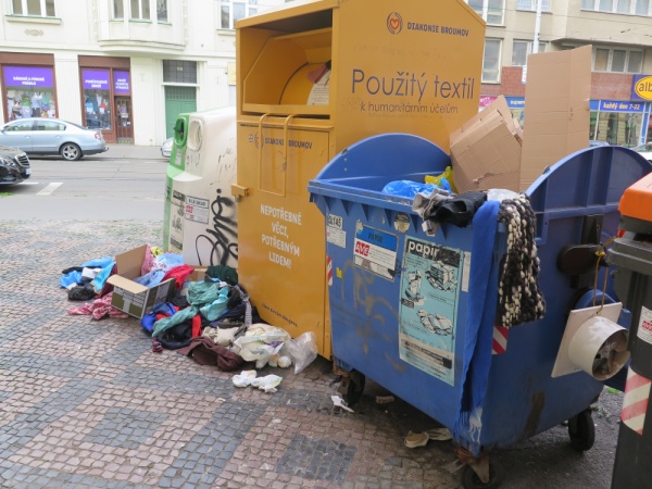 Včera tam někdo vyndal část oblečení z kontejneru a dnes je to už všude kolem :(