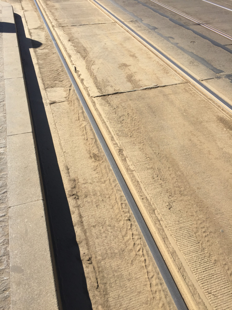U tramvajové zastávky Orionka (směr Flora) jsou panely s kolejemi pokryté silnou vrstvou jemného písku po celé délce. Projíždějící auta a zejména tiráky zajíždějící do kulisárny písek zvíří. Není to parodostné pro dýchání a ani oblečení čekajících cestujících.