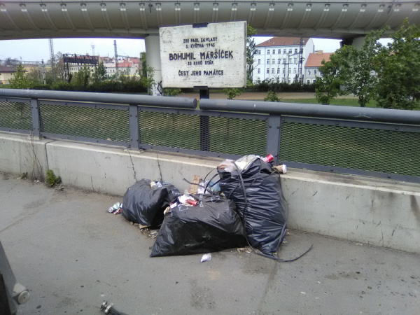 Nepořádek (3 igelitové pytle s odpadky) na chodníku pod pamětní deskou