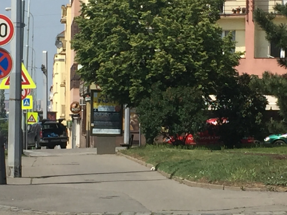 V parku vedle restaurace Kozel u Basilejského náměstí leží uhynulé zvíře (kousek od reklamního stojanu, v trávě).