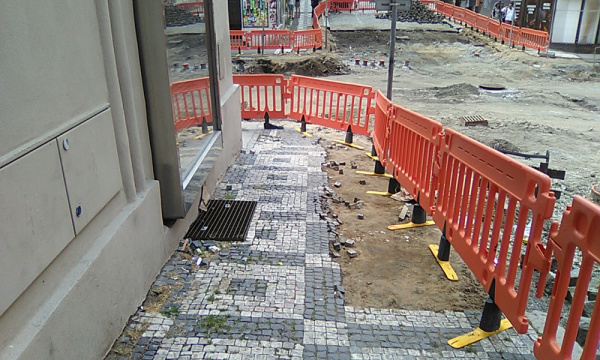 Tříděný odpad na chodníku, kde bývaly kontejnery. Lidě chodí koridorem po odpadcích.