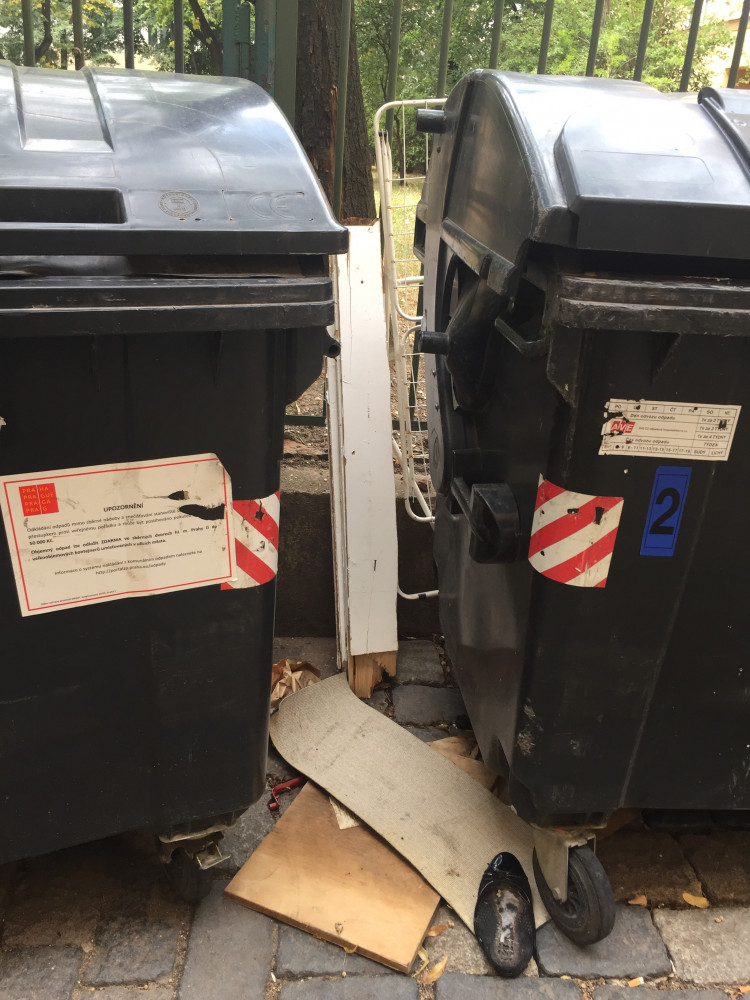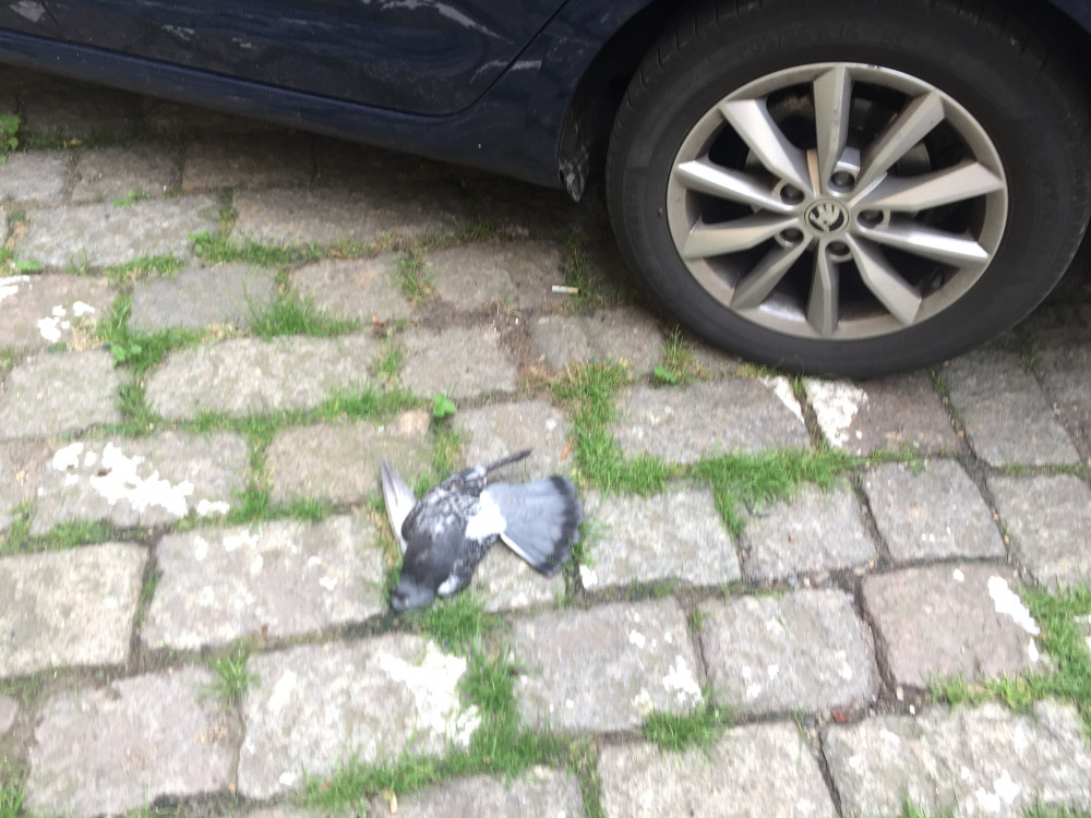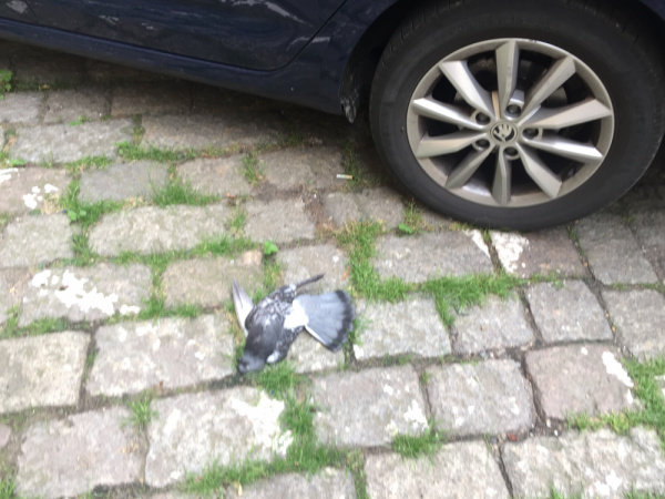 Neporadek kolem popelnic a mrtvy holub ve dvore vedle dum cislo 99. Dekuju za pomoci