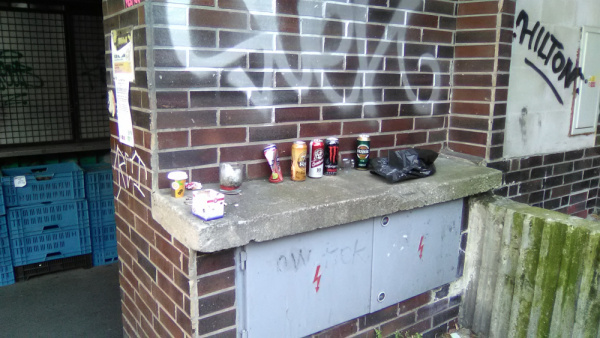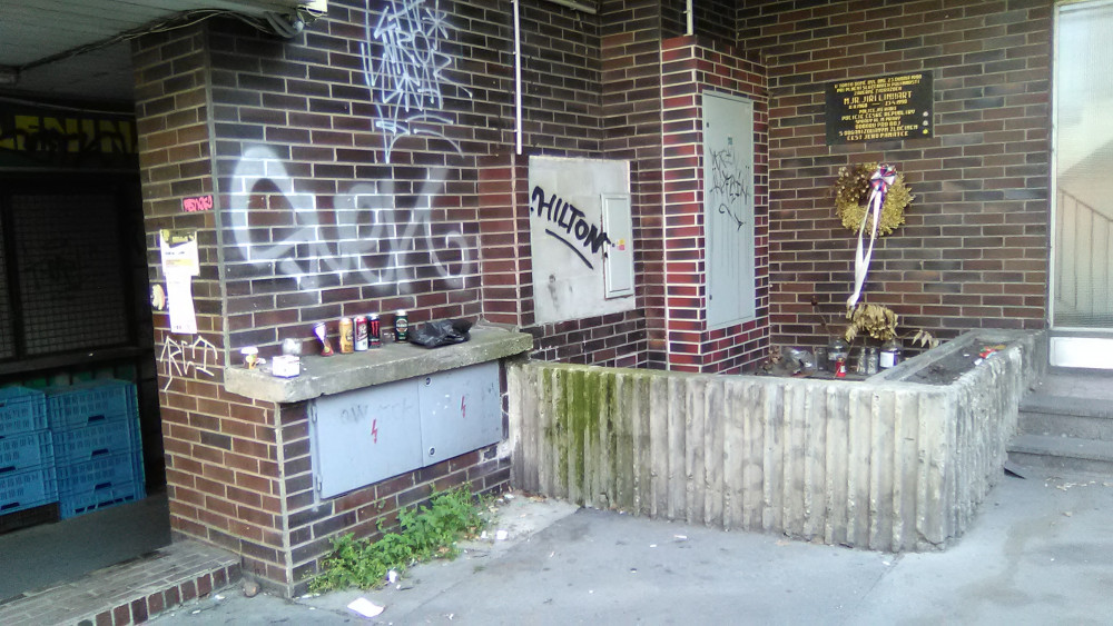 Nepořádek kolem pamětní desky na domě. Staré věnce apod.