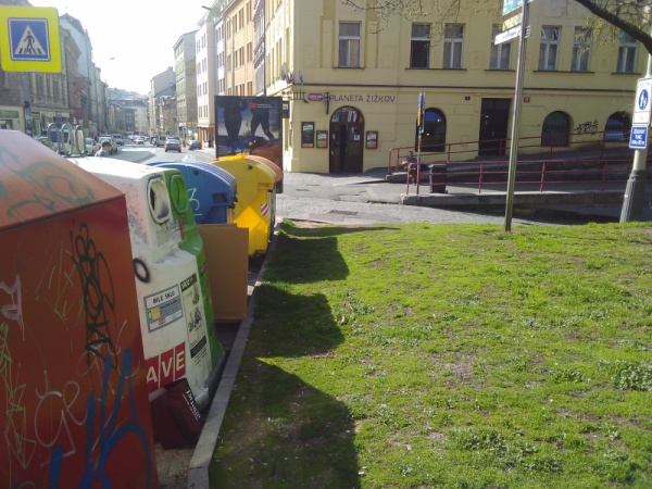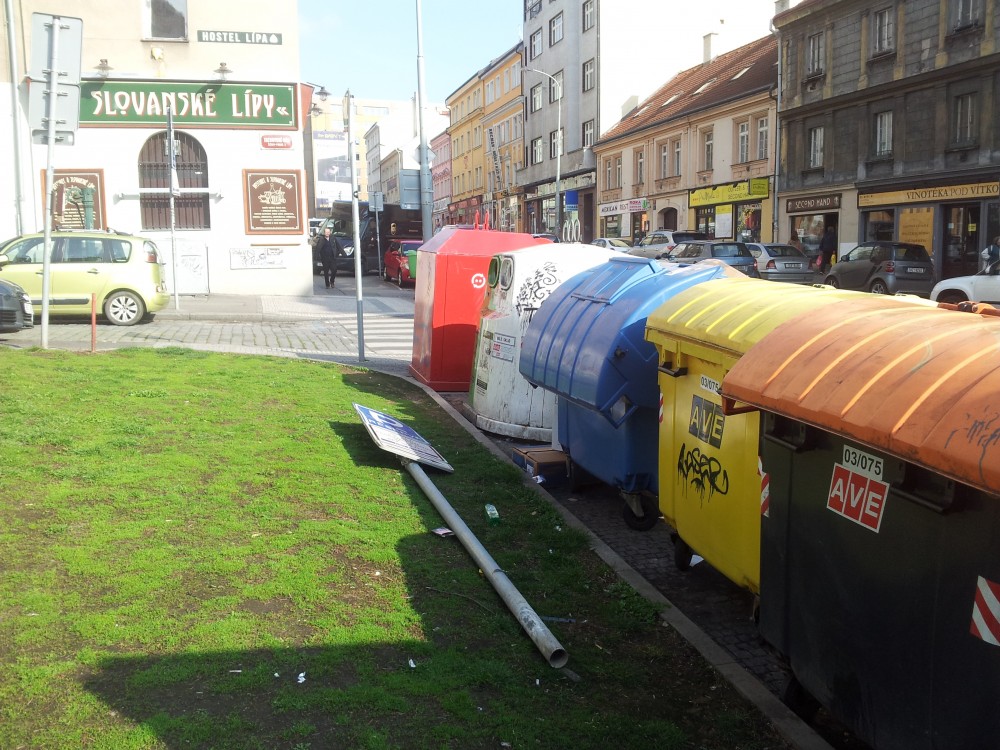 Dobry den, na Tachovskem namesti kdosi vyvratil dopravni znacku a nyni lezi vedle kontejneru na trideny odpad.