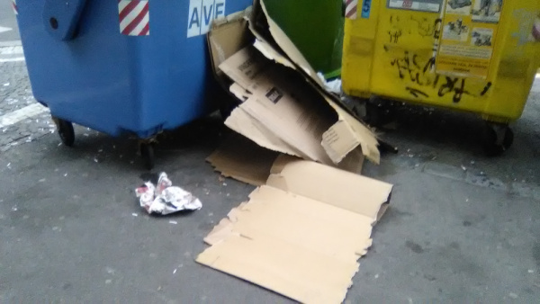 Přeplněné kontejnery na papír.. Papír se válí kolem a rozfoukává ho vítr.