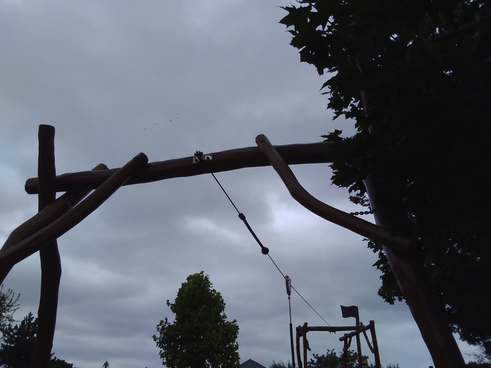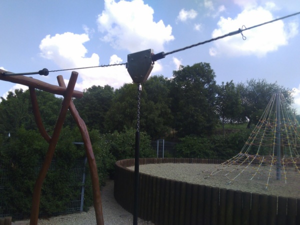 Hřiště na vrchu Sv. Kříže: rozbitá lanovka (poškozené potrhané lano). To musel byt mejdan :-/