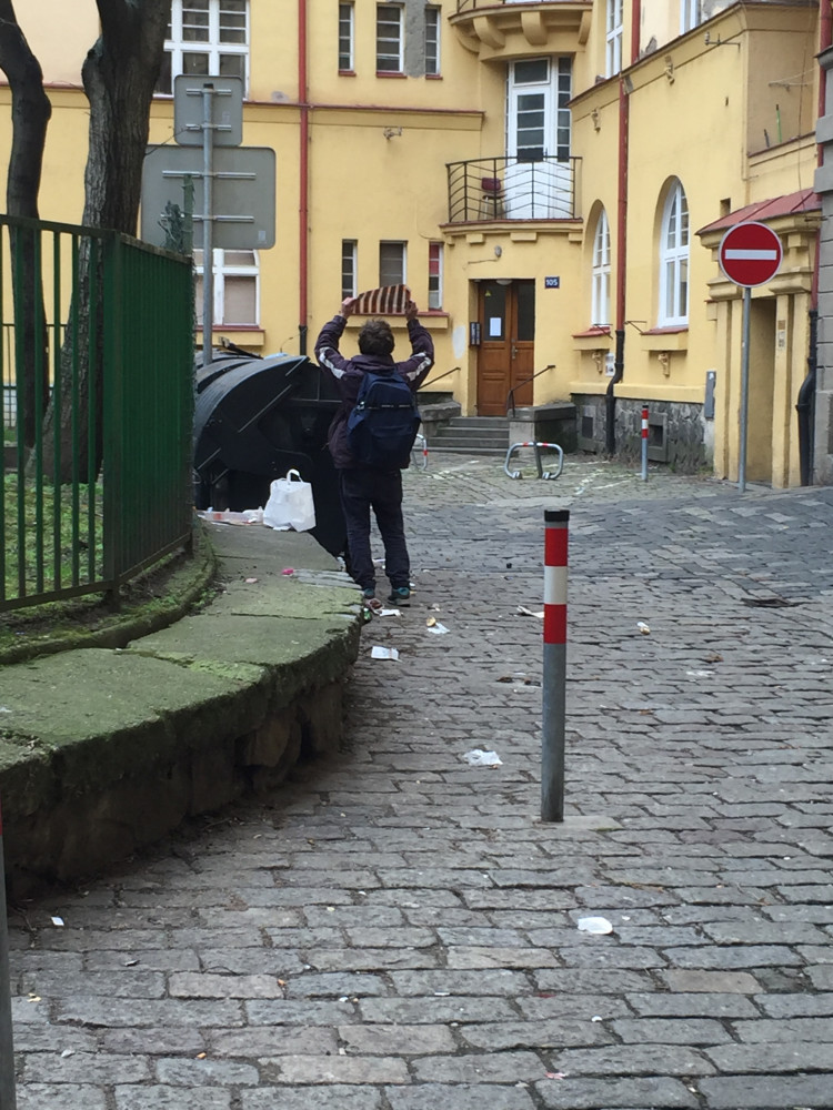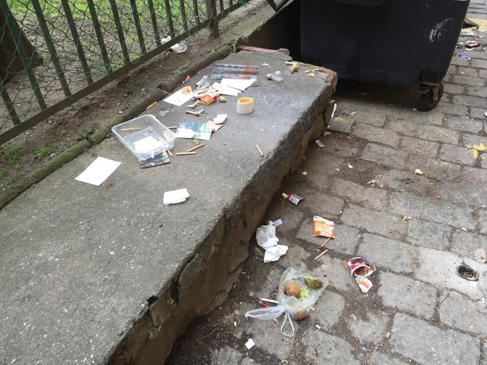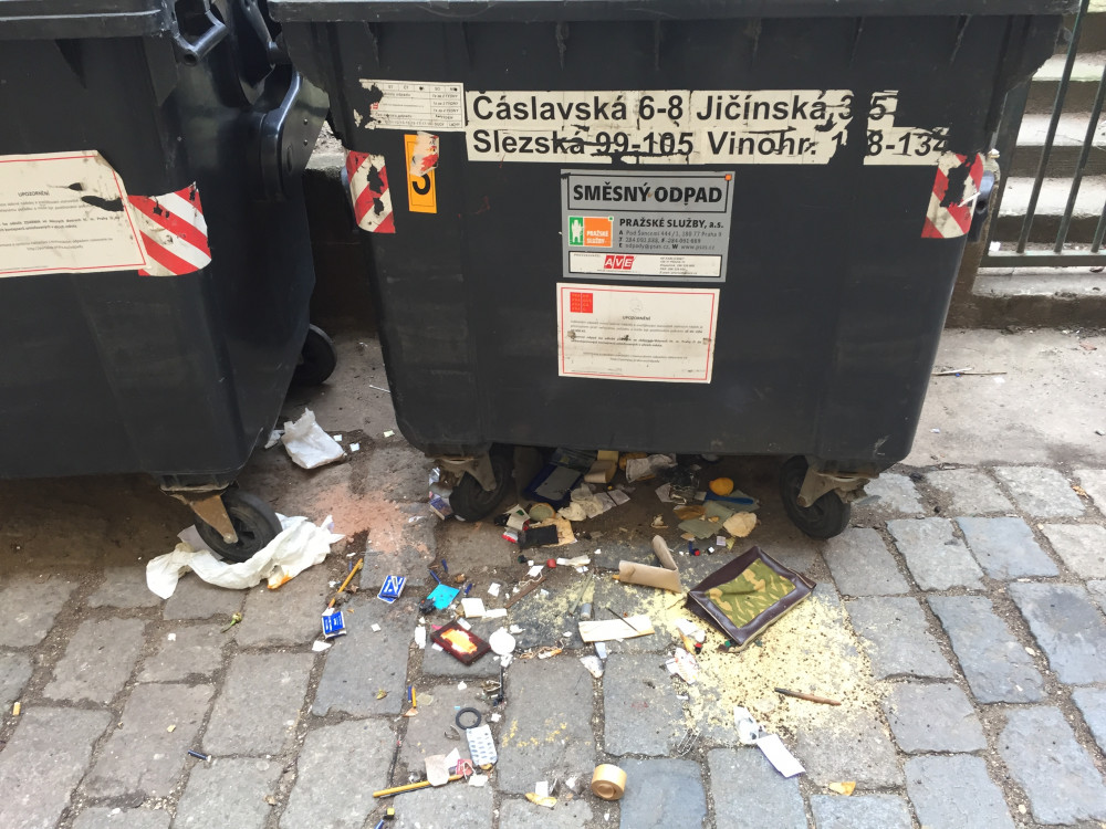 Maly drobky odpadu kolem popelnic. Moc dekujem za pomoc