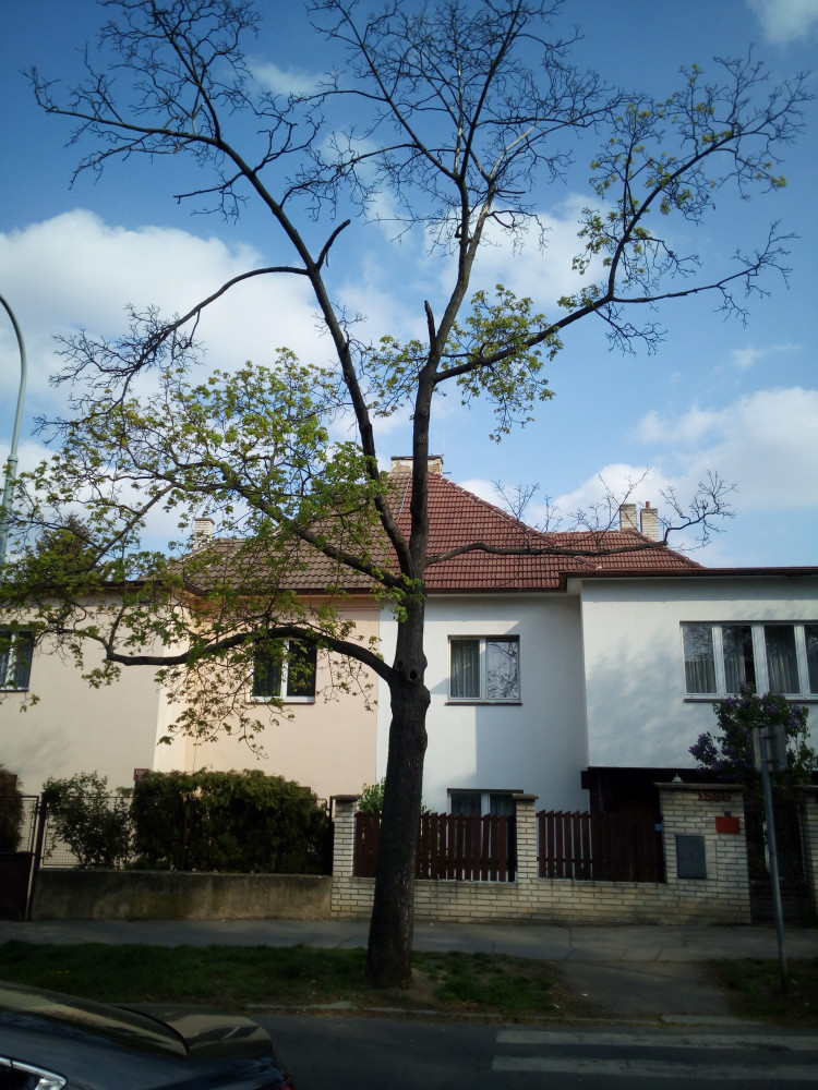 Tři velké, uschlé, nalomené větve v koruně stromu- při silnějším větru hrozí odlomení a pád na chodník.