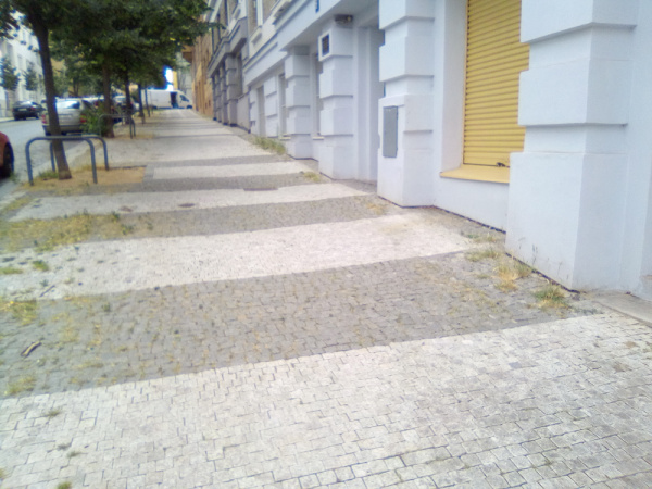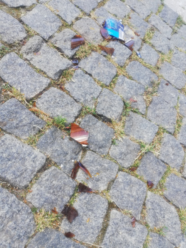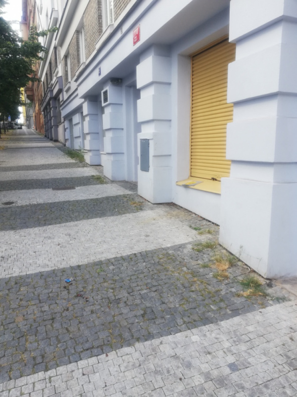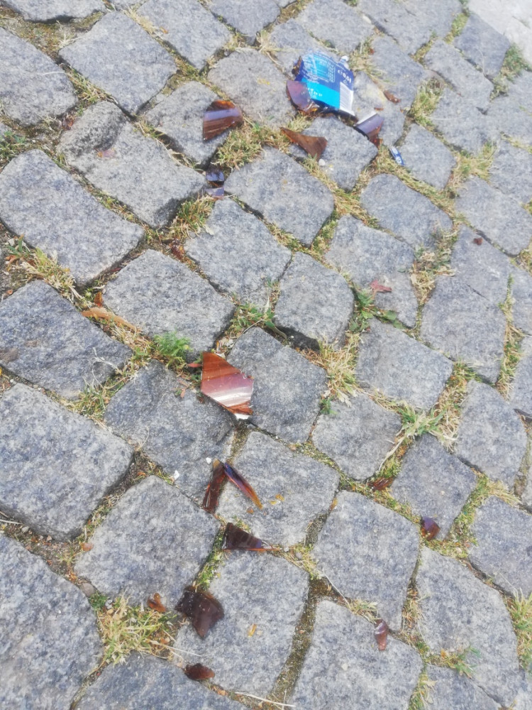 Rozbité sklo na chodníku. Radhošťská 1770/21