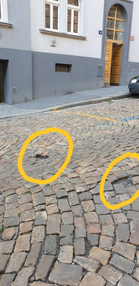chybějící dlažební kostky v silnici, před domem Krásova 14.