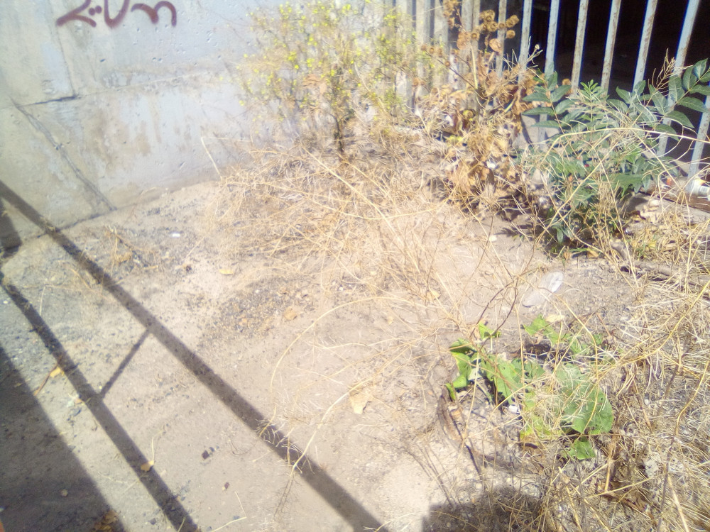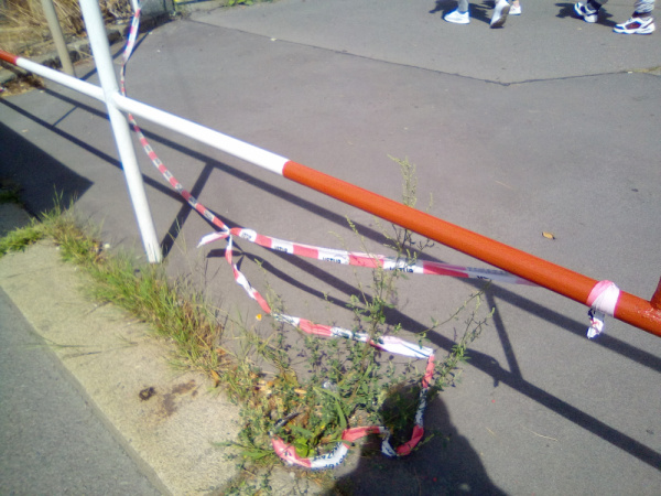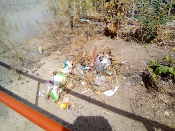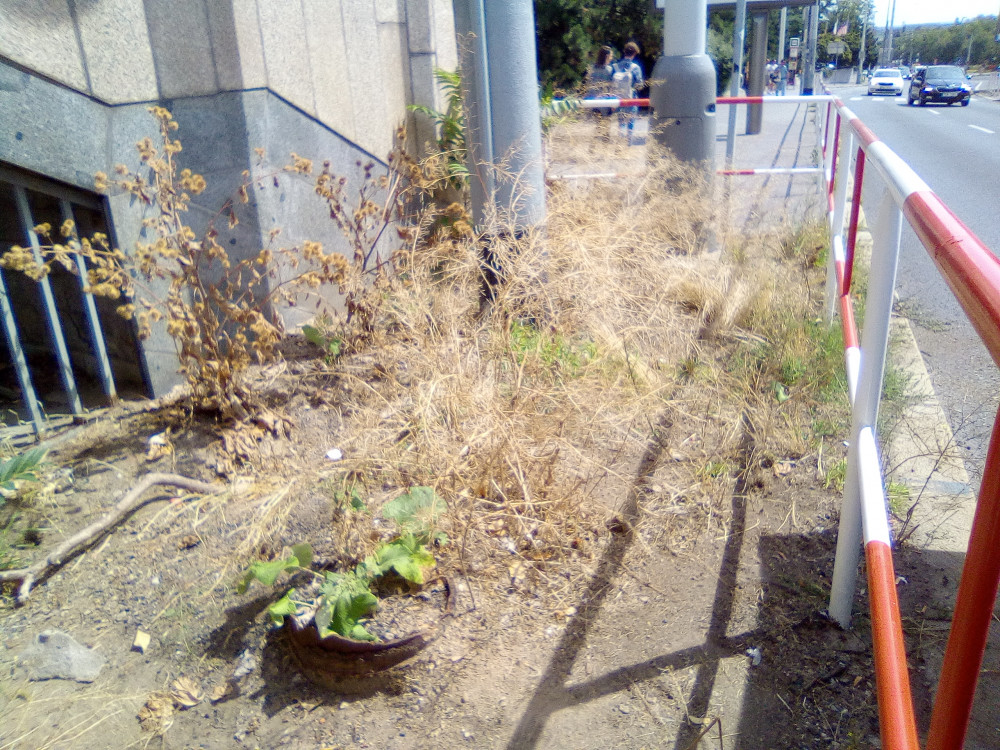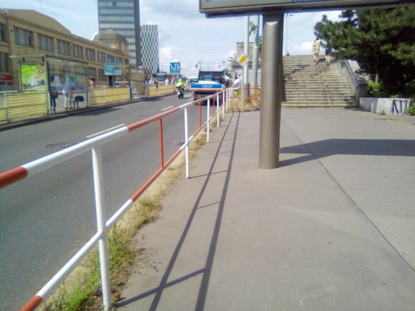 Odpadky vedle schodů u hlavní silnice. Dále prasklé a rozlétané pásky od nátěru zábradlí.