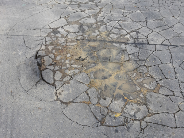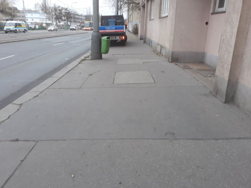Rozbitý chodník, nad úroveň terénu vystupuje asfaltová hrouda. Hrozí zranění chodců zejména za snížené viditelnosti.