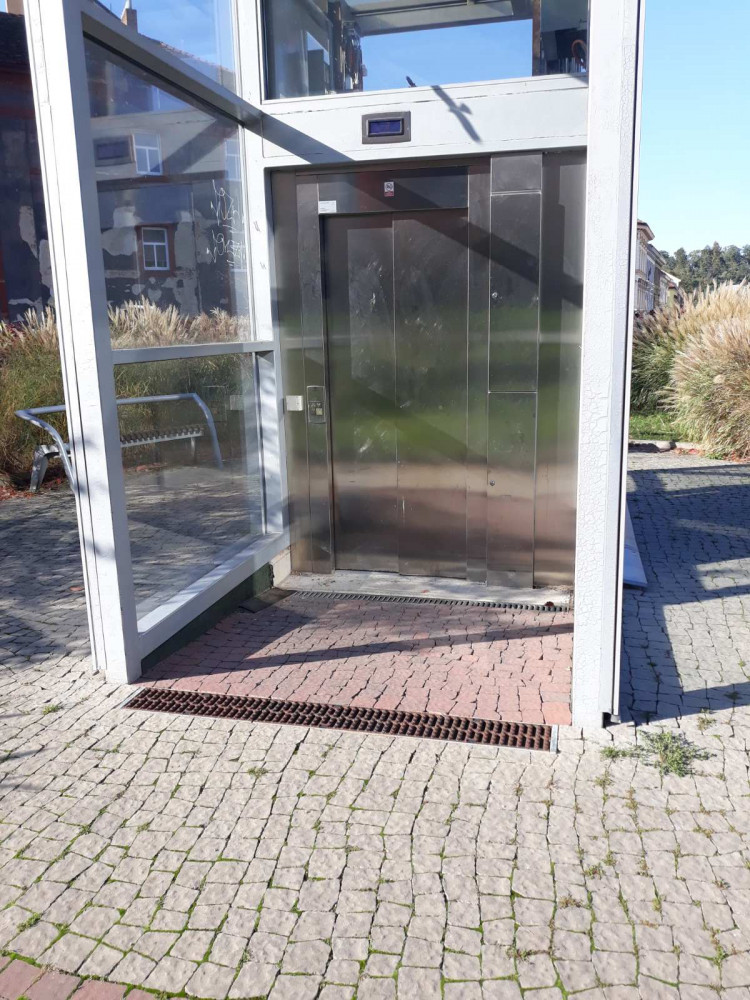 rozbité sklo a střepy u přístřešku venkovního výtahu z garáží
