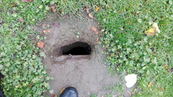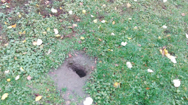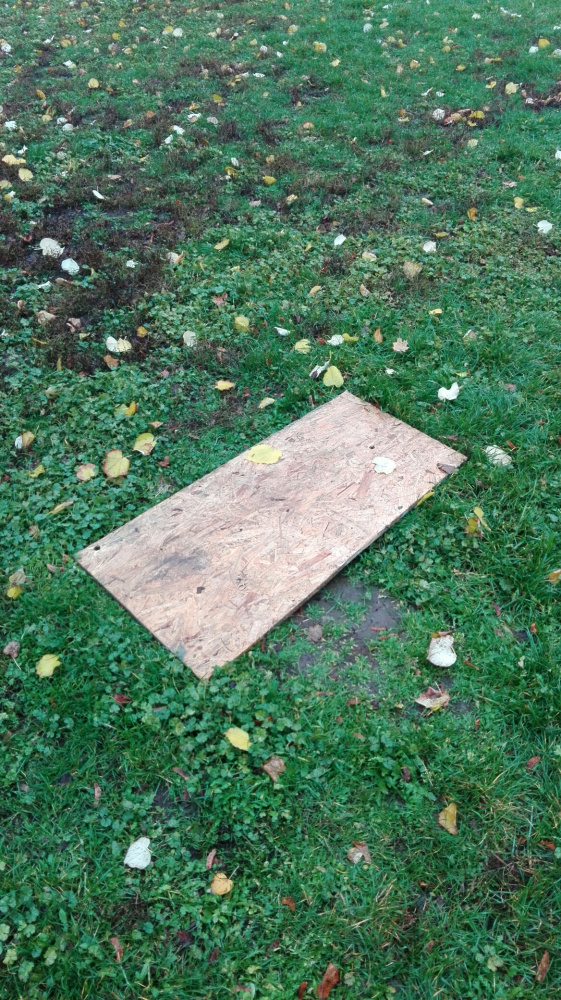 Díra v zemi v parku, prozatím přikryto OSB deskou.