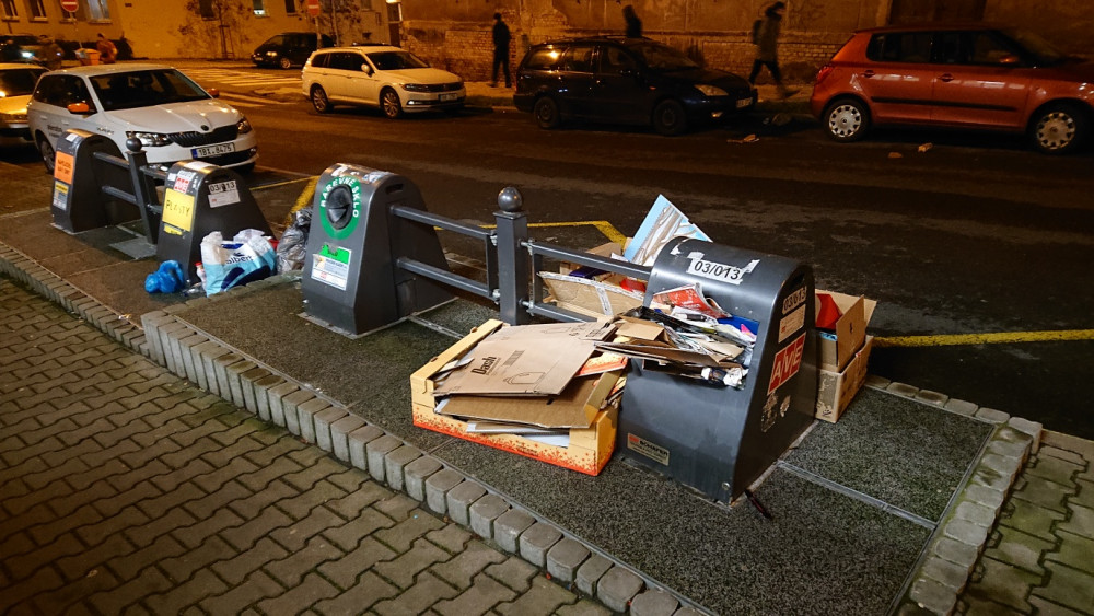 opět přeplněné kontejnery na tříděný odpad. 16.12. v 19:30. Uklidit kolem nich nestačí. Je třeba je častěji vyvážet.