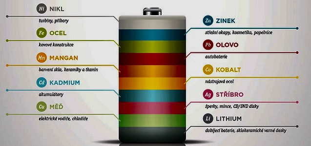 Kadmium – kadmia se můžeme nadýchat nebo se jím kontaminovat z potravin pěstovaných na kadmiem zamořené půdě. Kadmium je již dva roky zakázáno v bateriích používat.